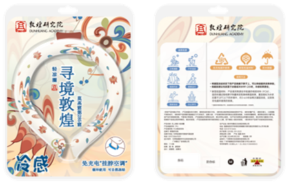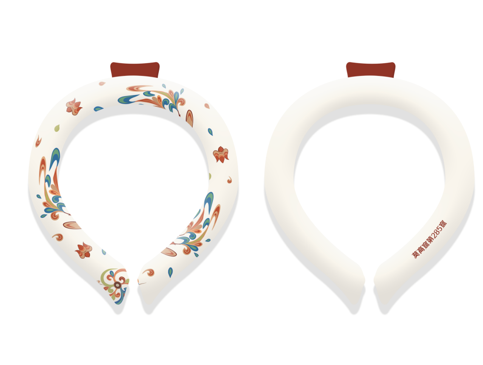 本商品以轻凉圈为载体,巧妙融入敦煌莫高窟第285窟万神殿的飞天莲花和飞天乐伎为主体设计语言的经典元素。